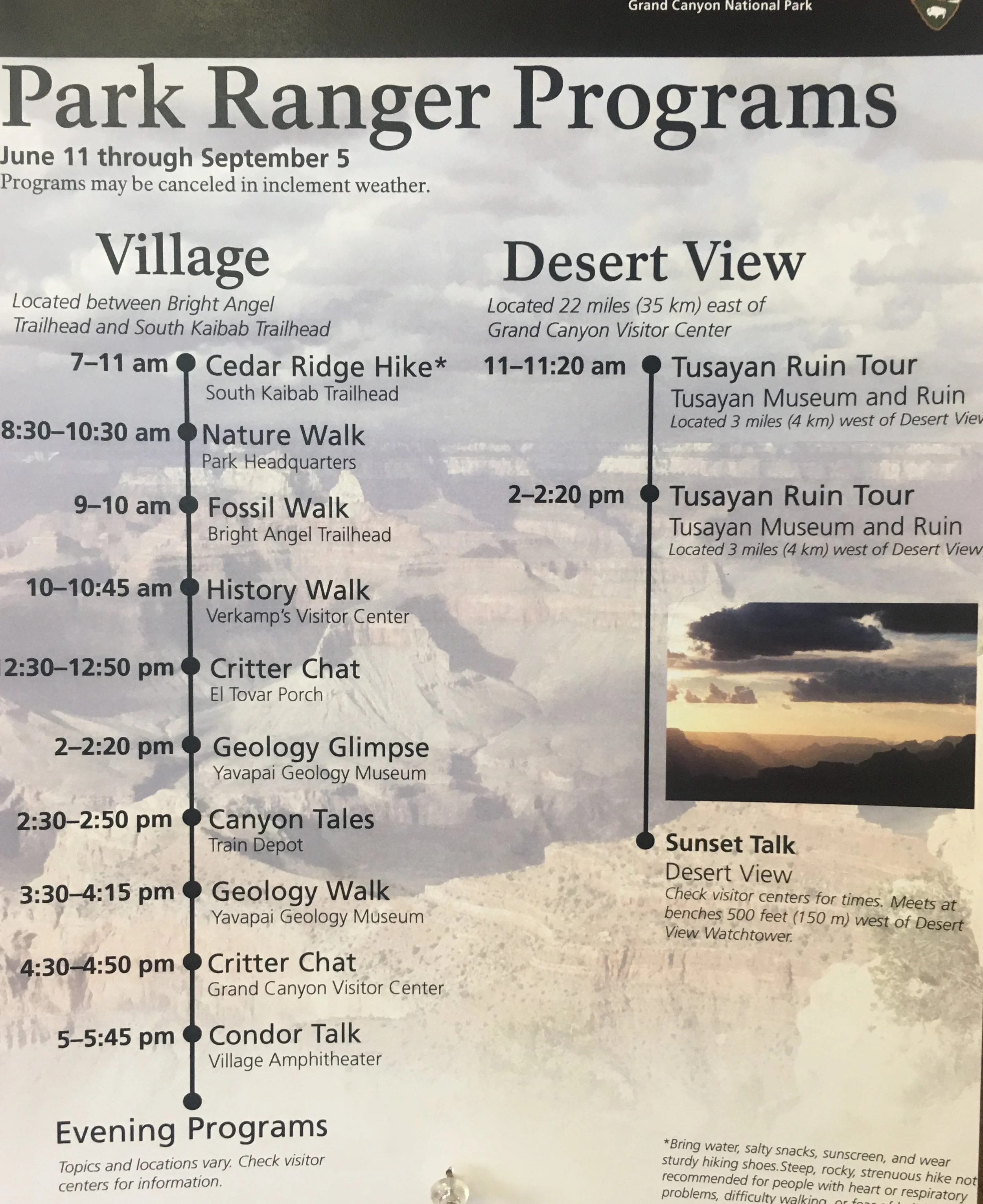 One of the many reasons I enjoy traveling to National Parks are the many Park Ranger Programs they have to offer.  We all learn so many new things as we explore the parks along side the rangers, soaking in all of their knowledge of the area.  Below is an example of what is offered during the summer months.  This trip we actually attended almost all the programs listed below with the exception of one or two.