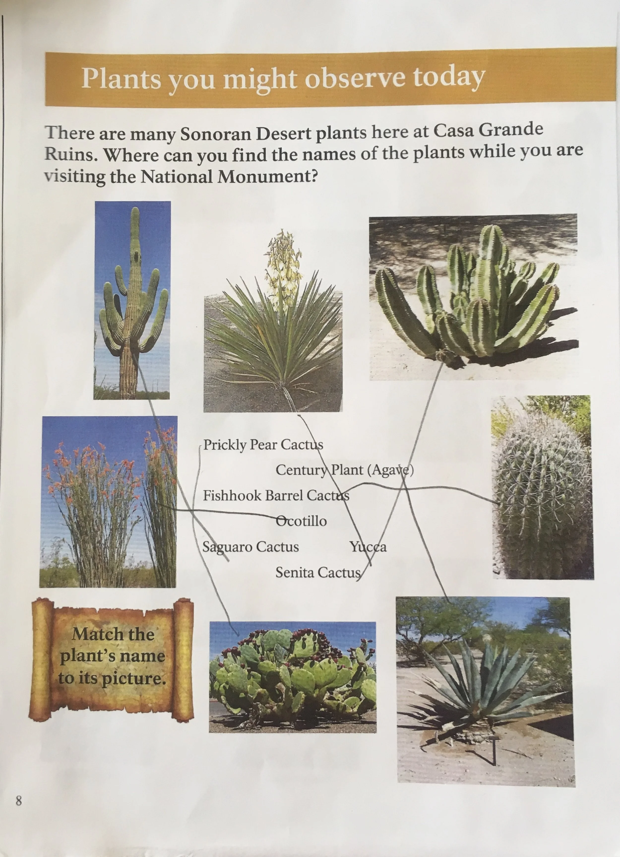 As you enter the museum on your left you will find a plaque that discusses the native language of the ancient Sonoran Desert people.  This plaque gave us the ability to complete page fourteen completely.